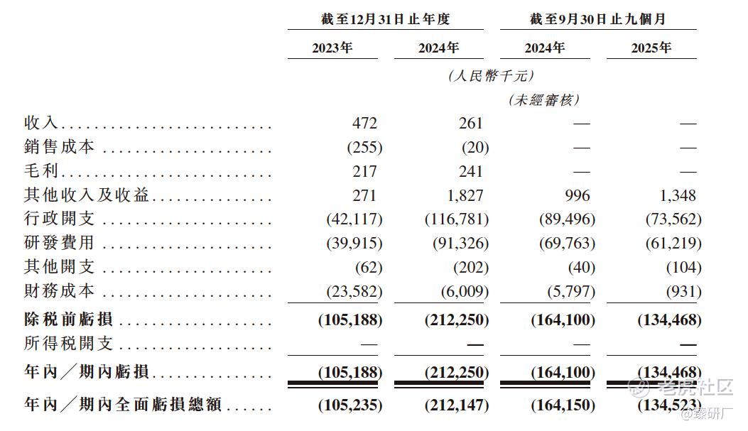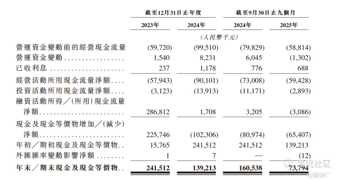 自2023年-2025年Q3公司的经营活动所有现金流量净额为人民币0.58亿、1.00亿及0.59亿,而公司的期末现金及现金等价物分别为人民币2.42亿、1.39亿及0.74亿,现金流对于公司运营来说具有较大压力。公司的主要运营资金来源为股东出资以及私募股权融资,2023年后续年份现金及现金等价物减少较多的原因是融资活动的现金流量大幅减少所致。