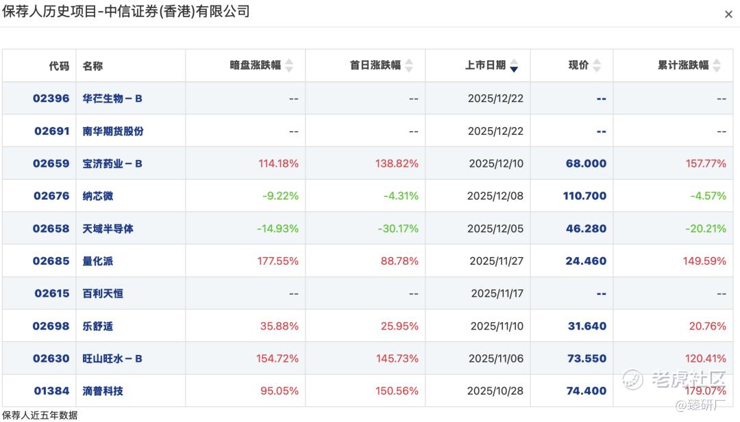 中信证券历史上作为保荐人参与了44个项目,暗盘有36家公司上涨,7家公司下跌,1家公司平盘,破发率15.91%;首日有37家公司上涨,6家公司下跌,1家公司平盘,破发率13.64%,破发率极低。中信证券在25年保荐数量具有显著的提升,并且在市场环境偏弱背景下维持较低破发率,说明其为数量规模与项目质量兼具的优质保荐机构。