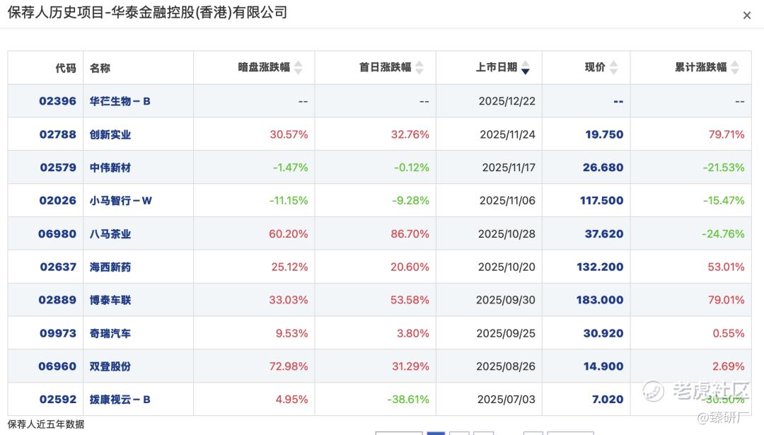 华泰国际历史上作为保荐人参与了64个项目,暗盘有33家公司上涨,28家公司下跌,3家公司平盘,破发率43.75%;首日有29家公司上涨,27家公司下跌,8家公司平盘,破发率42.19%,胜率总体一般。华泰国际今年共参与18个项目,其中有6家公司暗盘下跌,战绩较为一般。