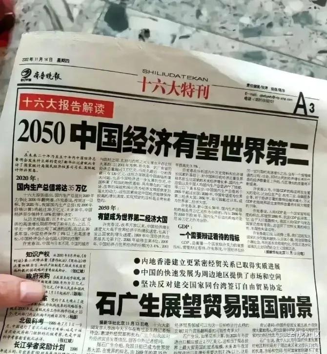 而我们又是哪一年GDP总量成为世界第二的呢?是2010年!比报纸所提到的2050年整整提前了40年!