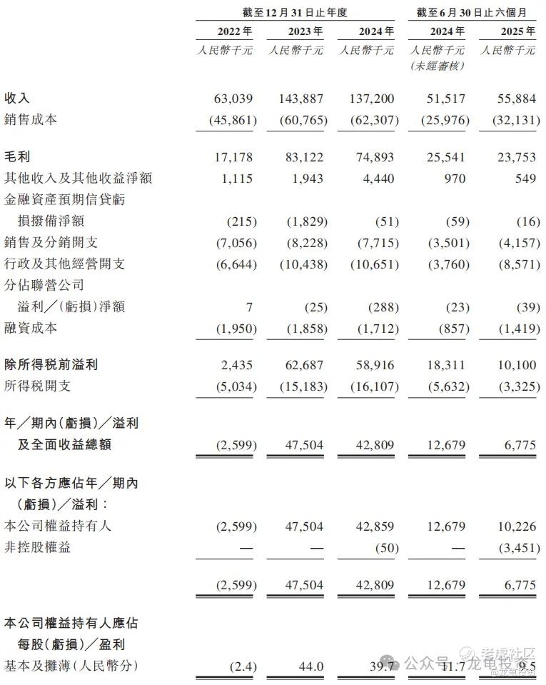 营收:2022年营收6303.9万人民币,2023年营收1.44亿人民币,2024年营收1.37亿人民币,截至2025年6月30日止最近12个月营收1.42亿人民币。