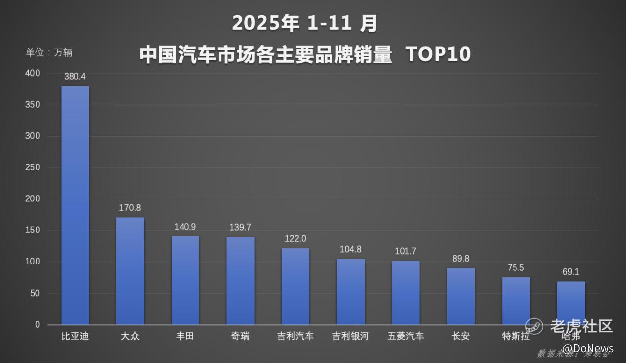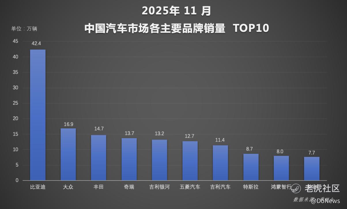 从累计数据看,2025年前11个月比亚迪累计销量418.2万辆,同比增长11.3%,年度销量目标完成率超九成。随着12月市场进入冲刺阶段,比亚迪有望超额完成全年目标。