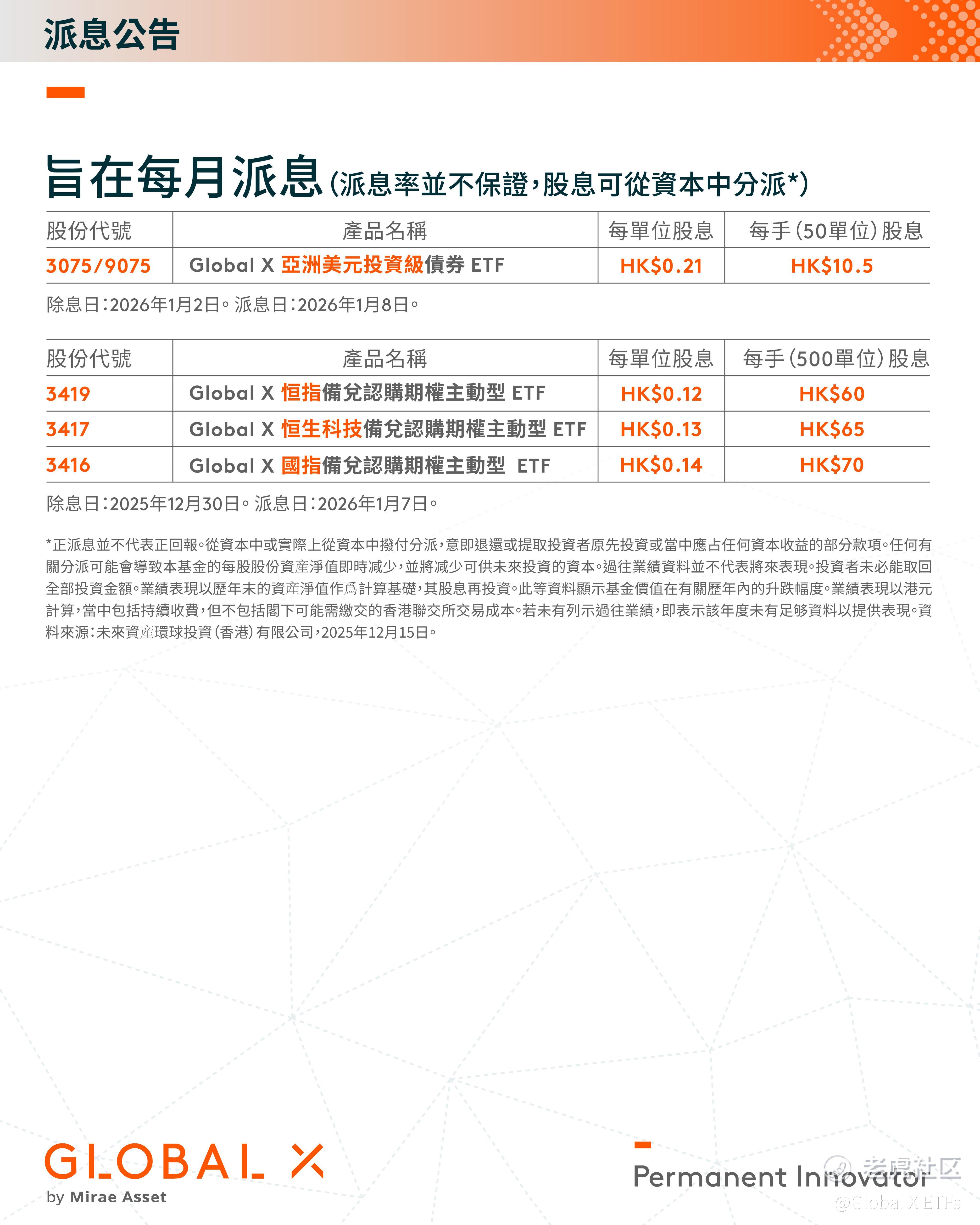 *正派息并不代表正回报。从资本中或实际上从资本中拨付分派,意即退还或提取投资者原先投资或当中应占任何资本收益的部分款项。任何有关分派可能会导致本基金的每股股份资产净值即时减少,并将减少可供未来投资的资本。过往业绩资料幷不代表将来表现。投资者未必能取回全部投资金额。业绩表现以历年末的资产净值作为计算基础,其股息再投资。此等资料显示基金价值在有关历年内的升跌幅度。业绩表现以港元计算,当中包括持续收费,但不包括阁下可能需缴交的香港联交所交易成本。若未有列示过往业绩,即表示该年度未有足够资料以提供表现。资料来源:未来资产环球投资(香港)有限公司,2025年12 月15日。