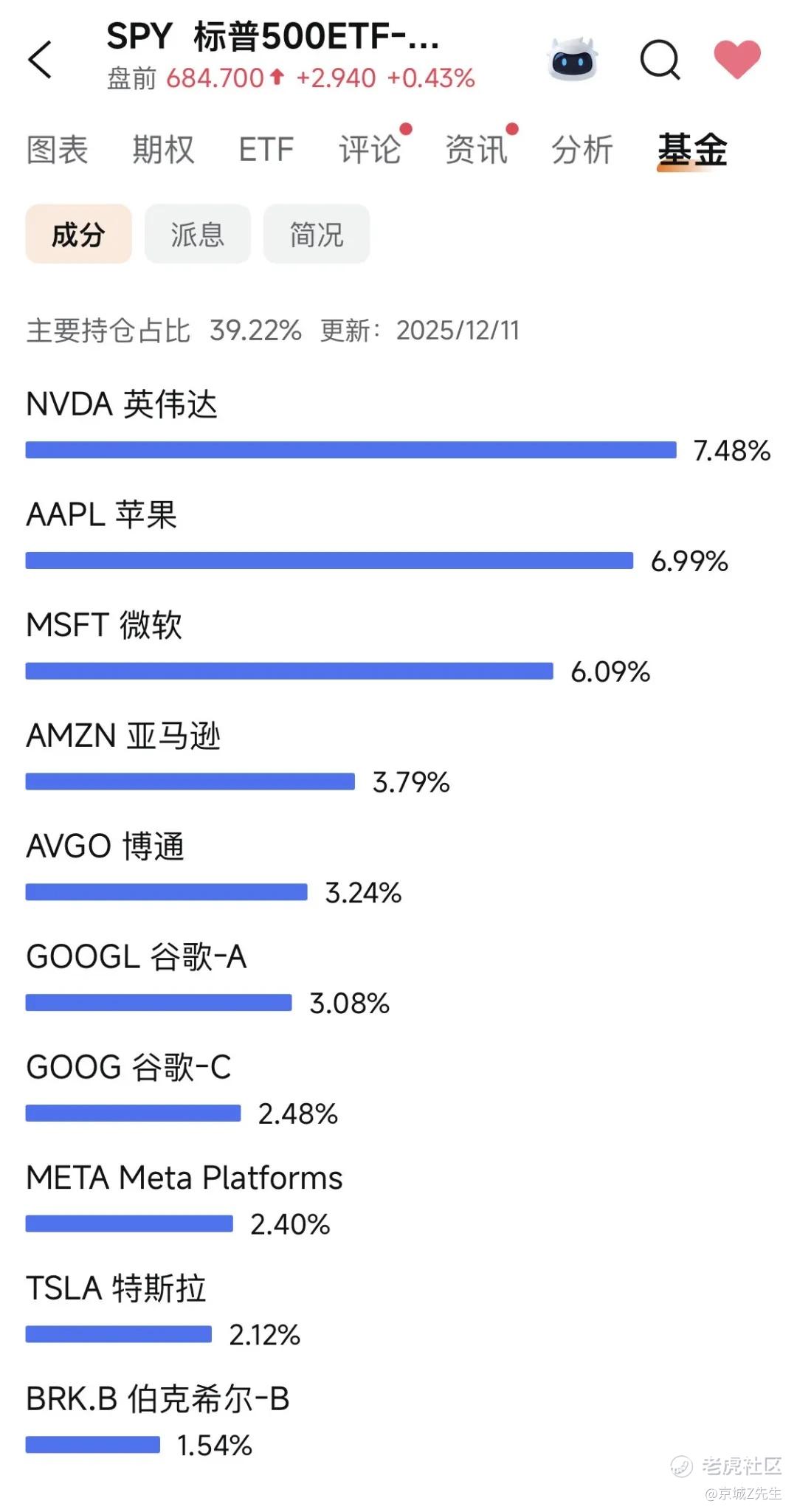 宽基指数ETF的代表,标普500ETF(SPY)的持仓股比例,科技七巨头的集中度高度集中,如今再加上博通,他们已经超过40%的权重。
