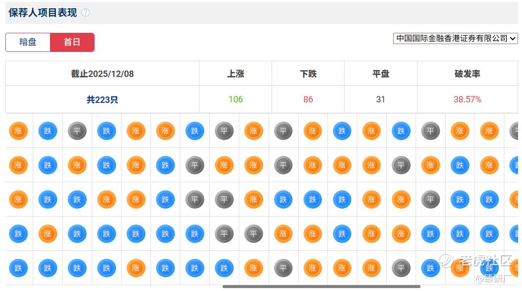 中金历史上作为保荐人参与了223个项目,其中暗盘有102家公司上涨,95家公司下跌,破发率42.60%。首日有106家公司上涨,86家公司下跌,31家公司平盘,破发率38.57%。