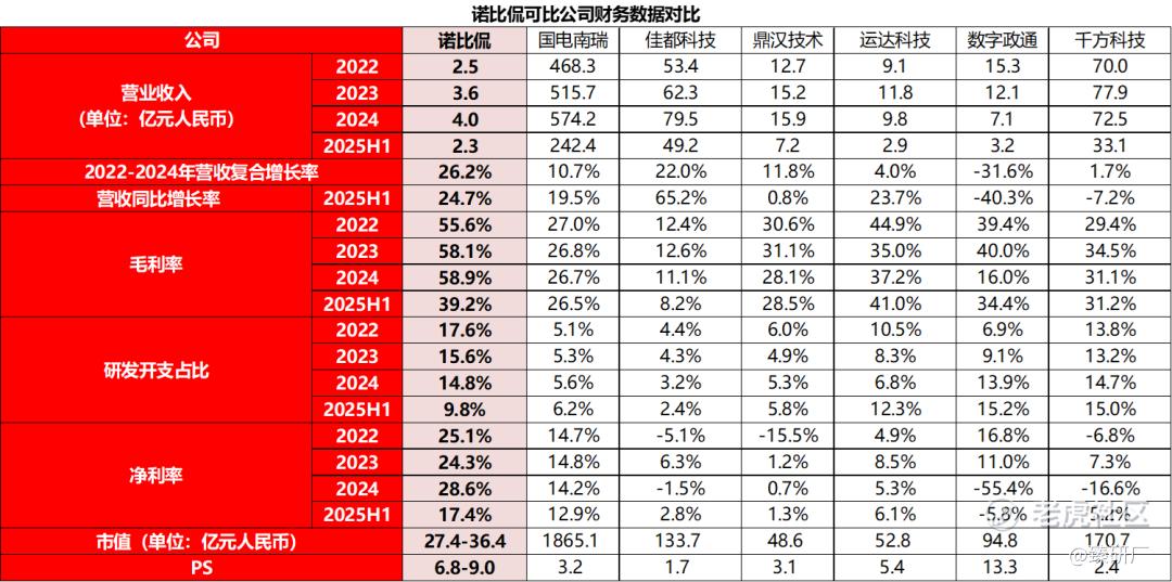 按此次发行价及2024年营收计算,诺比侃PS为6.8-9.0倍,远高于数字政通外的其他可比公司。市场给予了诺比侃 “高成长 + 高毛利” 的估值溢价,但其 PS 已显著高于业务更成熟、规模更大的可比公司,这一高估值需要后续持续兑现稳定的营收高增长、毛利率维持在高位、盈利波动收窄来支撑;若未来出现业务拓展不及预期、低毛利业务占比进一步提升导致盈利稳定性下降,或研发投入难以匹配技术迭代需求等情况,其市值将面临回调风险。