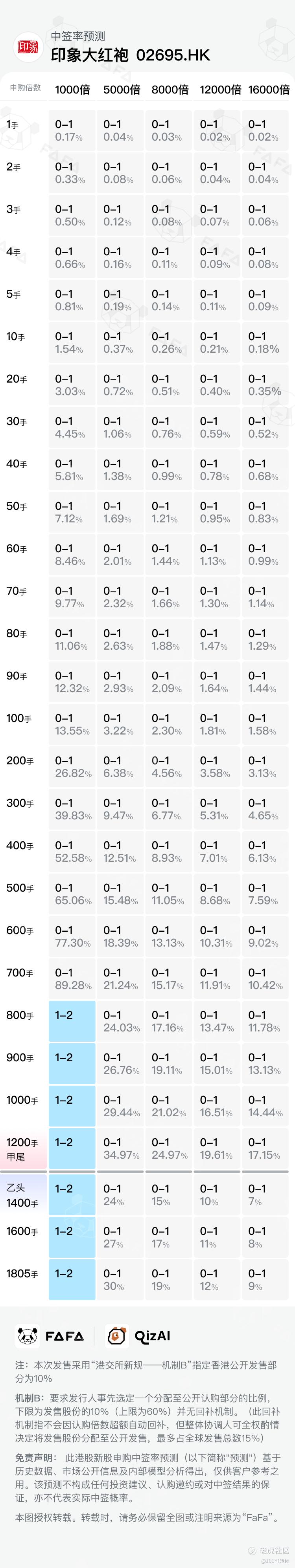 印象大红袍采用机制B,回拨10%;全球发售3610万股,香港发售361万股,一手是1000股,共计3610手,全员抽奖了;甲尾申购需要49万本金,乙头申购需要58万本金;现在热度近600倍,跟南华期货股份、明基医院、华芢生物-B、轻松健康、翰思艾泰-B、诺比侃资金都冲突,会分散资金安排;预计最终应该是在2000倍左右。由兴证和凯盛保荐,无基石,有绿鞋,历史保荐项目还可以。