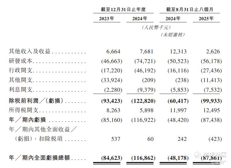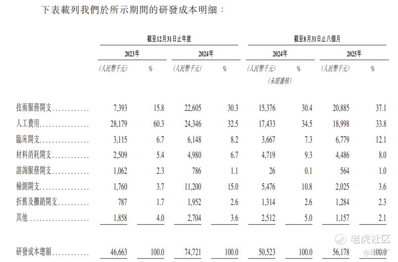 研发成本呈现持续增长态势,成本涵盖人工费用、临床开支、技术服务开支、检测开支、材料消耗开支、折旧及摊销开支、咨询服务开支及其他这八项内容,这些研发成本主要投入到核心产品的临床试验、HX044与HX111的临床前研究,以及聘请第三方制造商为HX301生产临床检测试剂等工作中。2023年至2024年,研发成本由人民币4,666万元增加60.1%至人民币7,472万元,主要源于核心产品HX009、HX044、HX301及HX111临床试验的CMC成本上升、HX044及HX111临床前毒理学检测开支增加以及自供应商采购的材料(含HX301的活性药物成分及HX044、HX111的原材料)数量增长,带动材料消耗开支增加。2024年8月31日止八个月至2025年8月31日止八个月,由5,052万元增加11.2%至5,617万元,增长主要由于HX009、HX044及HX111临床试验的CMC成本增加、研发人员平均薪酬及人数提升,以及股份激励相关开支增加700万元。