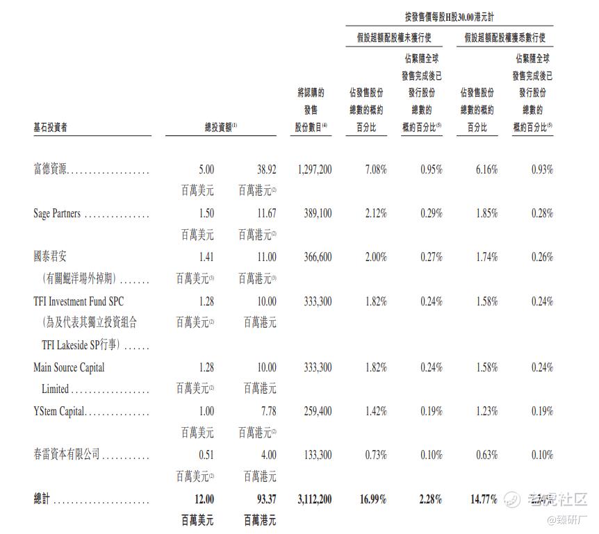 本次发行拥有7名基石投资者,分别为富德资源、Sage Partners、鲲洋、TFI Investment(天风证券拥有)、Main Source Capital、YStem Capital、春雷资本合计认购9,337万港元,按发售价每股发售股份30.00港元按发售价中值计算,基石投资者认购的发售股份总数为3,112,200股,约占根据全球发售发行的发售股份的16.99%(假设超额配股权未获行使)。富德资源是富德控股集团的子公司,总资产超6000亿,管理资产规模近万亿元。国泰君安为中国领先的证券公司国泰海通全资持有。