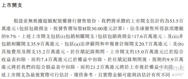 按发售价中位数30.00港元计算,公司上市总支出预计约为5,350万港元、约占所得款项总额的 9.7%。上市开支中约1,500万港元已于综合收益表扣除,约740万港元已于权益中扣除。预计990万港元将在综合损益表中扣除,约2,120万港元将在上市后于权益中扣除。