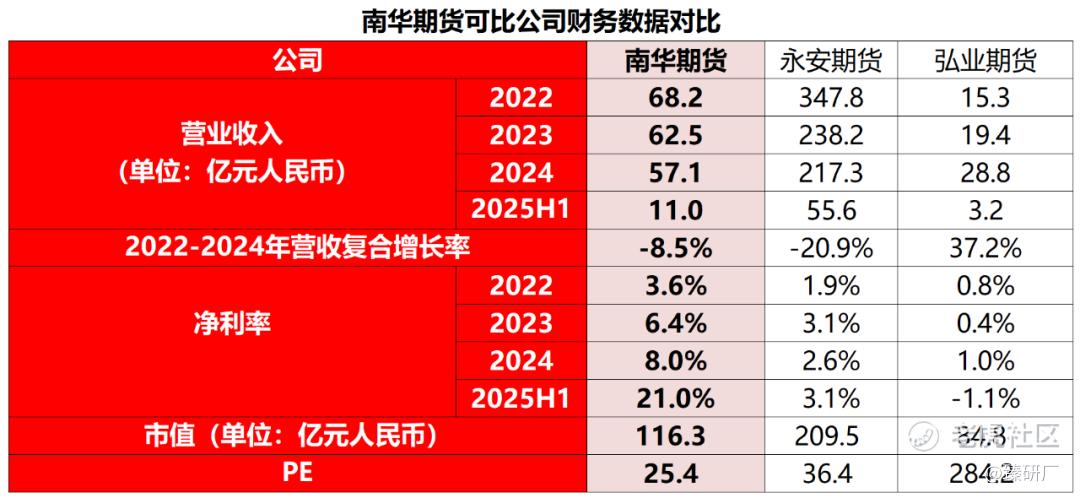 从估值上看,根据发稿日收盘的三家公司A股最新总市值,以及2024年末净利润进行估值。南华期货的估值倍数均低于另外两家,弘业期货由于其净利润基数较低,导致估值数据较大,为284.2X,南华期货和永安期货的PE为36.4X和41.4X。