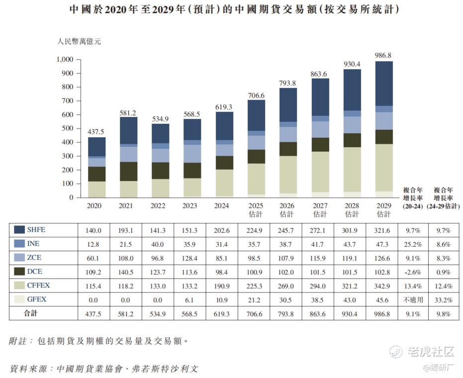 2020-2024年,中国期货交易额从437.5万亿元人民币上升至619.3万亿元人民币,CAGR为9.1%,预计未来随着中国经济稳步增长,企业活动将更加活跃,大宗商品需求增加,中国期货市场规模逐步扩大,2029年预计中国期货市场交易额达986.8万亿元人民币,2024-2029年CAGR为9.8%。