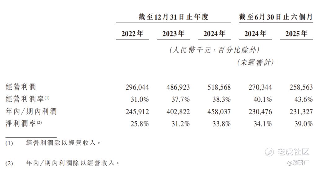 2022年至2025年上半年,公司的经营利润率分别为31.0%、37.7%、38.3%、43.6%,净利润分别为2.5亿元、4.0亿元、4.6亿元、2.3亿元,对应的净利率分别为25.8%、31.2%、33.8%、39.0%。