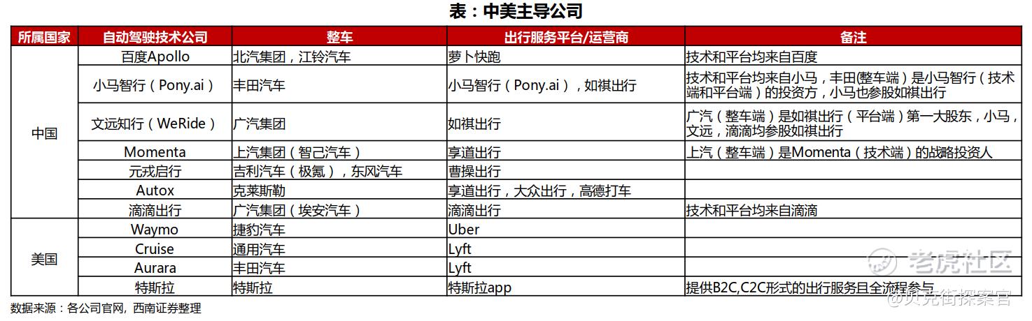 美国技术主导是Waymo、Cruise等自研全栈技术,特斯拉较为特殊,全环节参与;整车代工是捷豹、克莱斯勒提供定制化车辆(无技术主导权);平台导流是Uber/Lyft纯运营方,无技术能力。