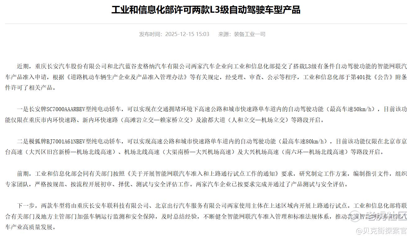 2025年12月15日,重庆长安汽车股份有限公司和北汽蓝谷麦格纳汽车有限公司,正式获批搭载L3级有条件自动驾驶功能的智能网联汽车产品准入。