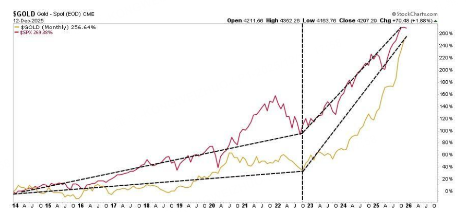 你要注意了,国际清算银行(BIS)在2025年12月季度评估报告里突然指出:黄金与股票出现罕见的“双重泡沫”,强调说“黄金与股票价格同步飙升的现象至少在近半个世纪以来从未出现过”,他们认为黄金在2025年上涨约60%,已经创1979年以来最强年度表现,而美股在科技股与AI相关股票推动下创历史新高,自2022年10月起两者都呈抛物线式上涨并打破此前趋势线,这种走势被认为并非基本面驱动而更偏投机驱动