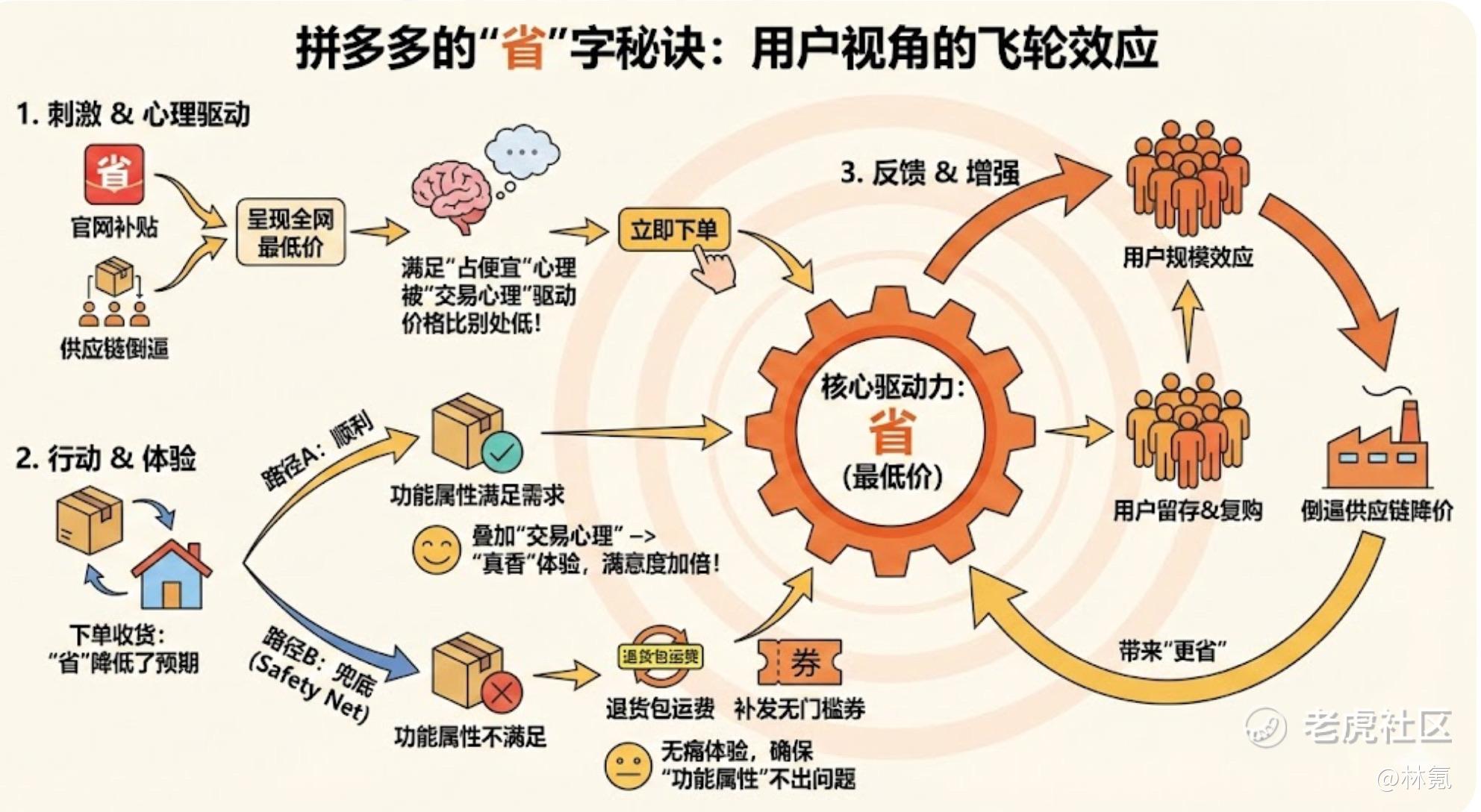 最终形成了飞轮效应:省(心理) → 下单 → 满意(实惠) → 复购 → 用户规模效应 → 倒逼供应链降价 → 更省(实际)