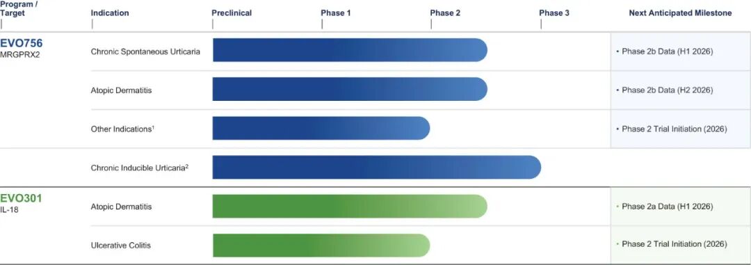 EVO756的主要适应症是慢性荨麻疹,今年5月发布的临床2期研究显示,300mg每日一次或50mg每日两次给药4周后,总体改善率达 93%,瘙痒评分(Pruritus NRS)较基线下降约50%,在安全性和药效上均达到慢性荨麻疹治疗的主要治疗终点。此外,EVO756还于8月启动特应性皮炎的临床二期研究。