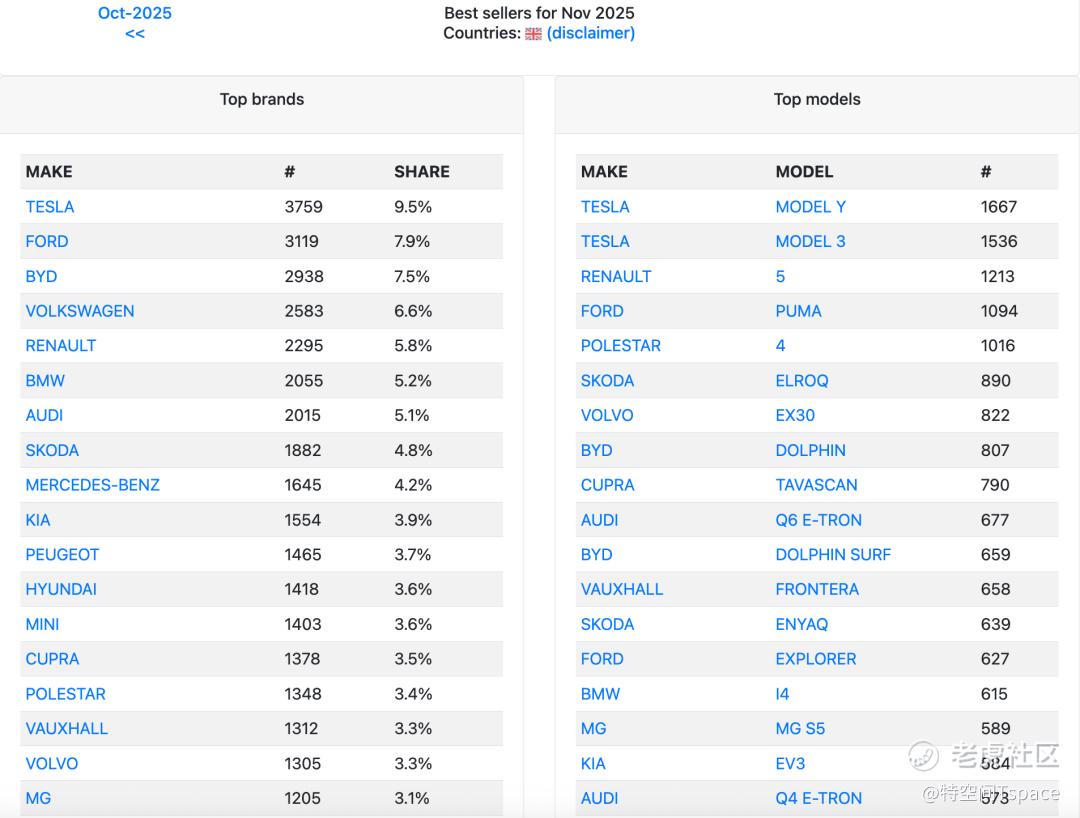 近日,海外权威调研机构EU-EVs发布最新统计数据,在11月英国纯电动车市场,特斯拉稳居销量第一。具体到车型来看,Model Y与Model 3则包揽了英国最畅销的两款纯电动车。