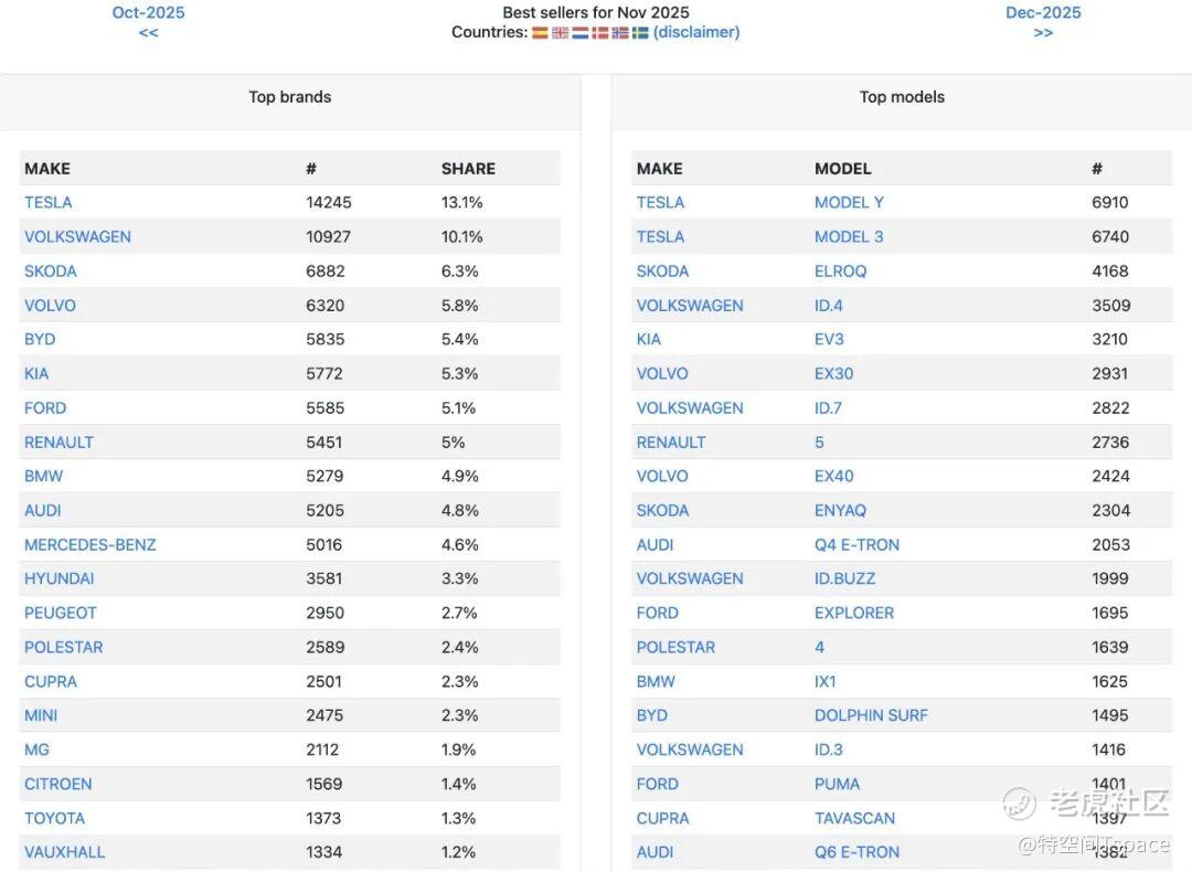 不仅在英国,凭借领先的市场份额,11月特斯拉在欧洲15国纯电动车市场中,稳居最受欢迎的电动车品牌。Model Y/3也展现出显著的销量优势,成为欧洲最畅销的两款纯电动车。