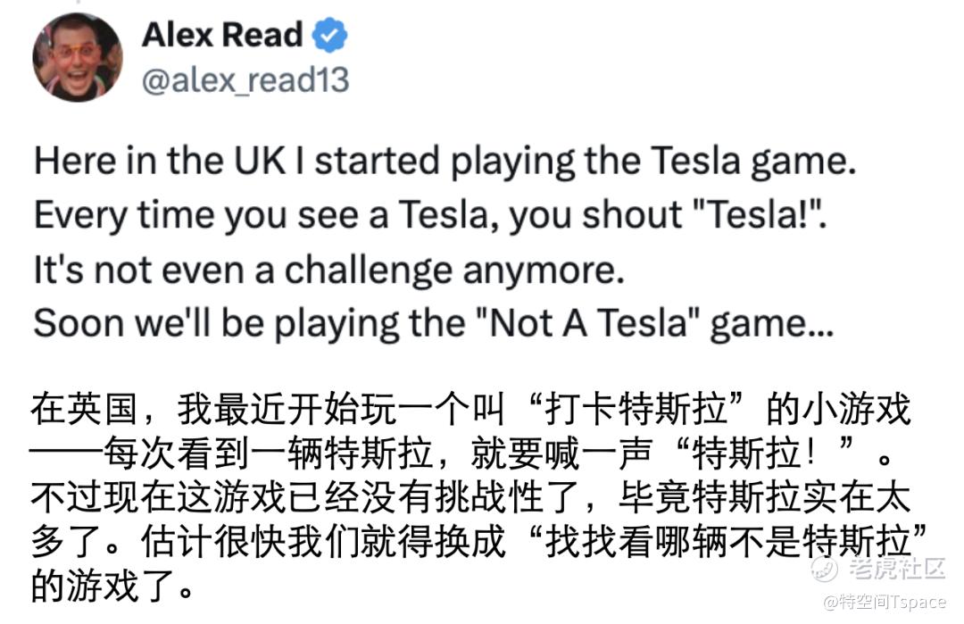 特斯拉的持续热销,使其在欧洲的出街率不断提升。海外网友@alex_read13 笑称:“以前在英国,我热衷于玩‘特斯拉打卡’游戏,每瞧见一辆特斯拉就兴奋地喊一声‘特斯拉’!可如今,这游戏变得毫无难度,照这趋势,估计我们很快就得把游戏改成‘找找哪辆不是特斯拉’了。”