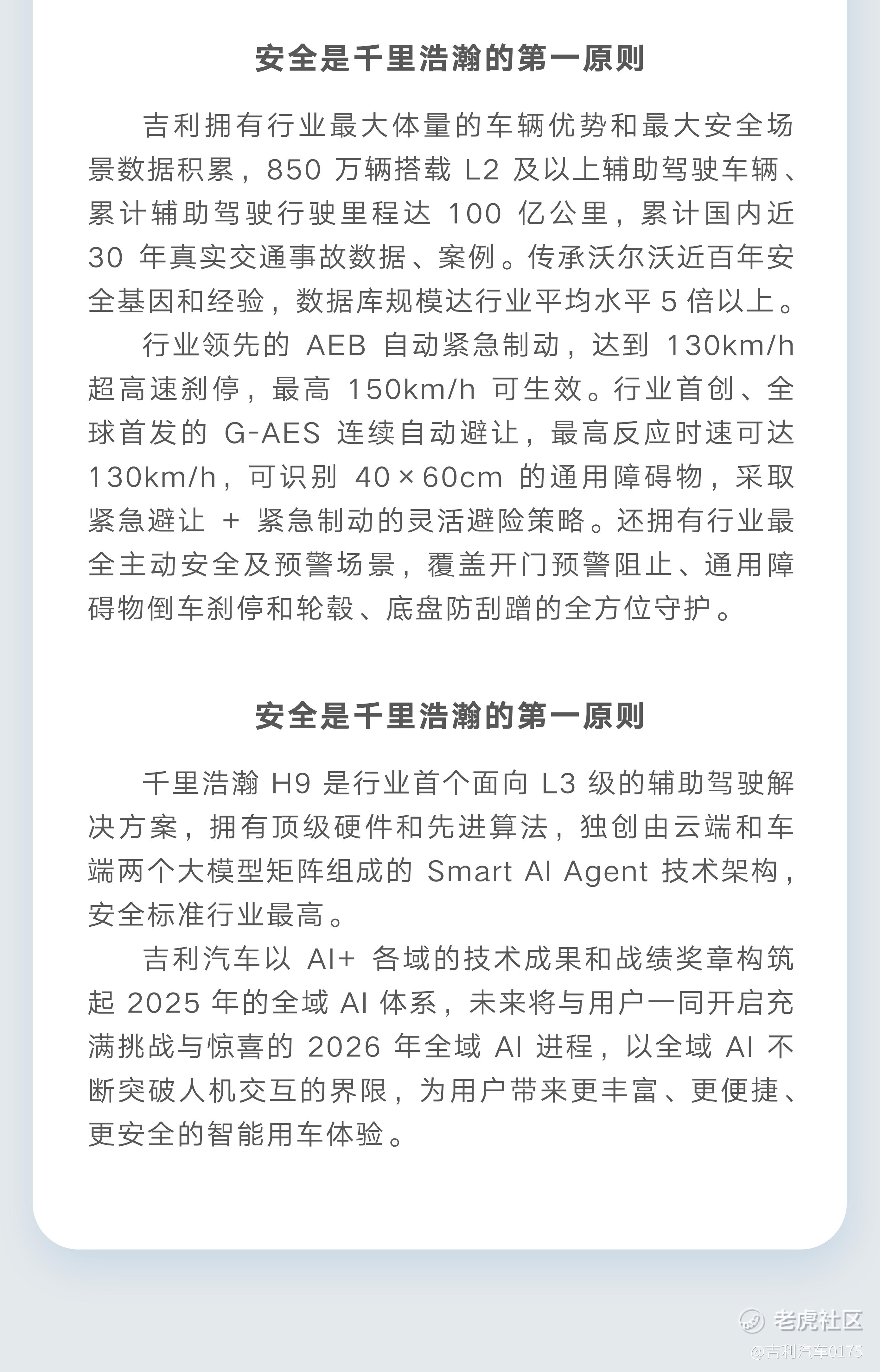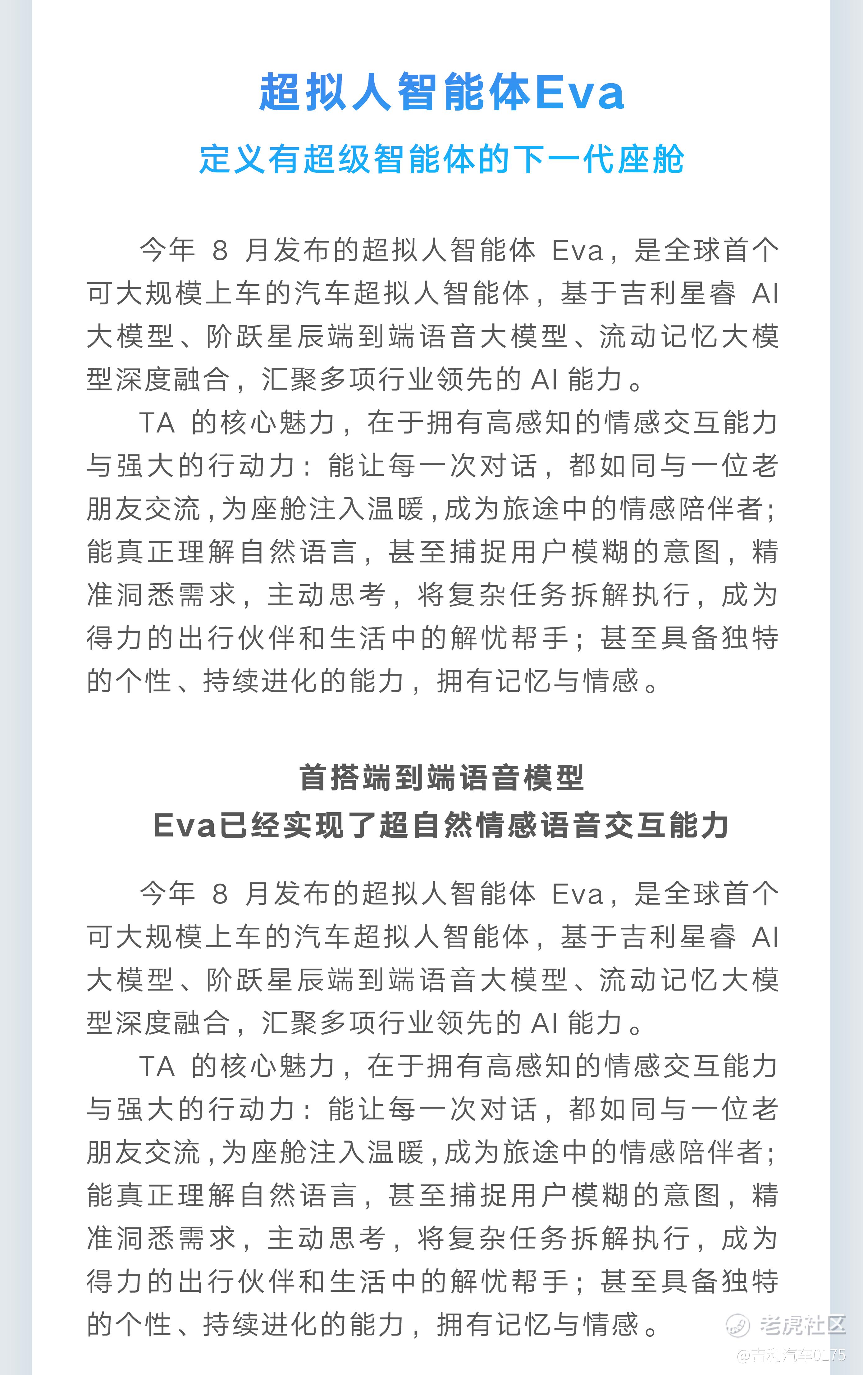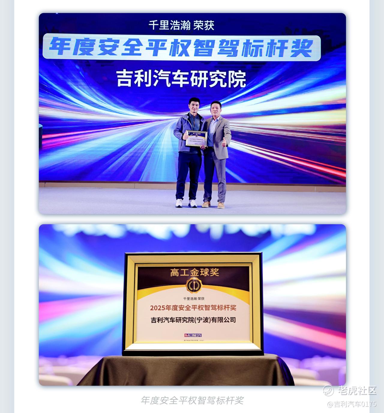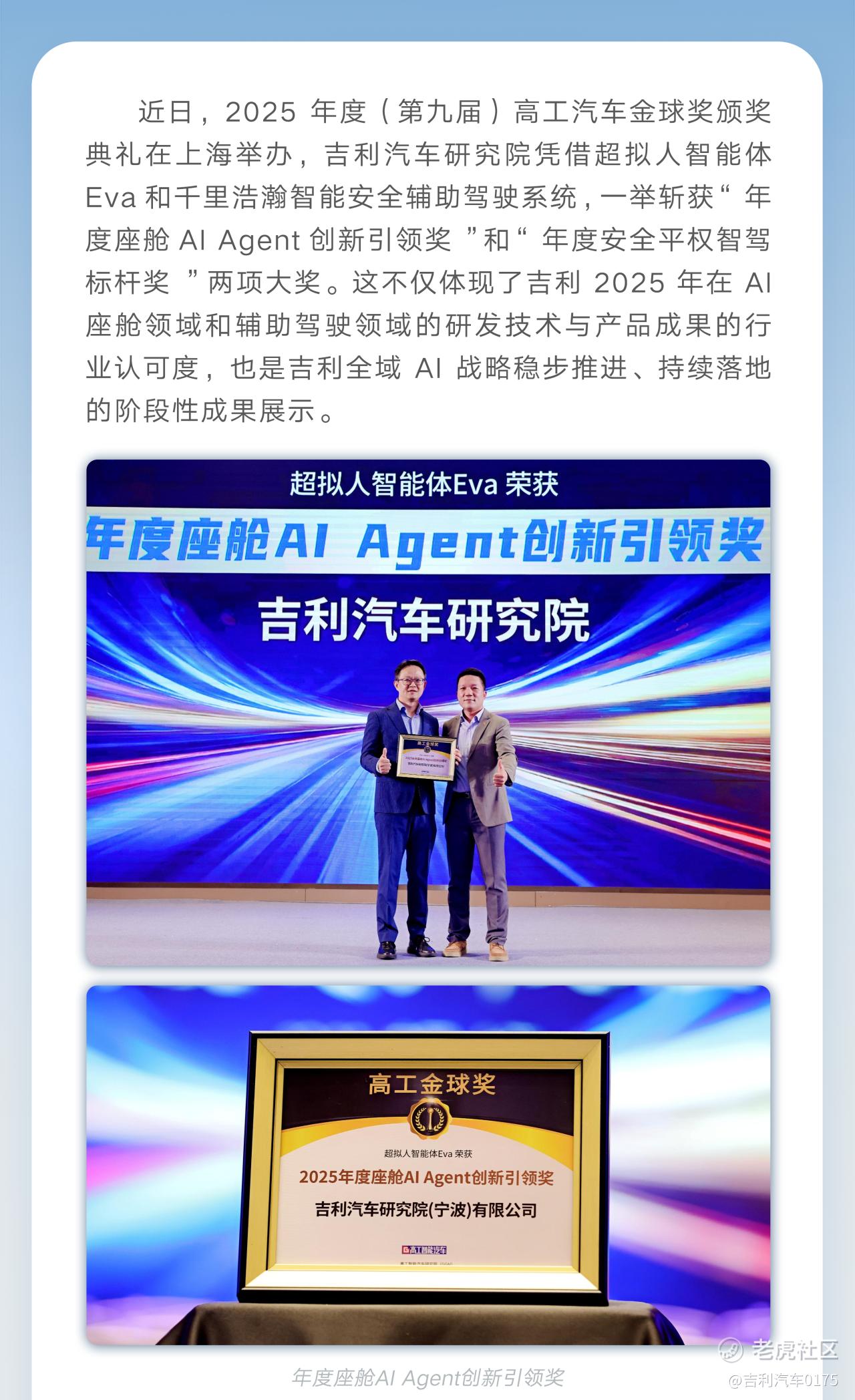 近日,2025 年度(第九届)高工汽车金球奖颁奖典礼在上海举办,吉利汽车研究院凭借超拟人智能体Eva 和千里浩瀚智能安全辅助驾驶系统,一举斩获“年度座舱 Al Agent 创新引领奖”和“年度安全平权智驾标杆奖”两项大奖。这不仅体现了吉利2025 年在 AI座舱领域和辅助驾驶领域的研发技术与产品成果的行业认可度,也是吉利全域 AI战略稳步推进、持续落地的阶段性成果展示。