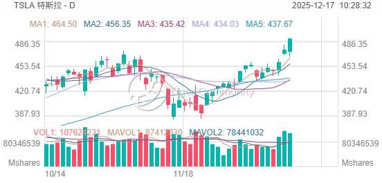特斯拉股价周二盘中一度涨至491.50美元,这是该股首次站上490美元关口。此前的盘中历史最高价为488.54美元,出现在2024年12月18日。