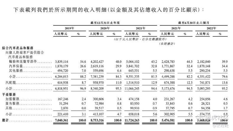 四者相加,在总营收中占比为93.2%,是最主要的营收业务。根据招股书,2019年—2022年上半年,轮胎营收占比分别为54.6%、48%、43.2%、39.9%,逐年下降;汽车保养营收占比分别为26.6%、29.9%、32.8%、34.4%,逐年上升。