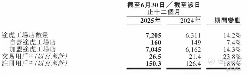到了今年6月底,注册用户有1.5亿,年交易用户数达到2650万,门店7205家,较上年同期的6311家增加14.2%,增加了894家,加盟店占比为98%。其中,自营途虎工场店有160家,较上年同期的149家增长11家;加盟途虎工场店有7045家,较上年同期的6162家增长883家。