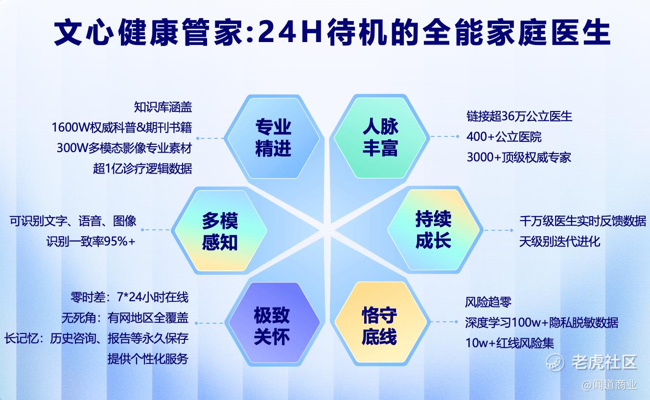 据介绍,文心健康管家具备专业精进、人脉丰富、多模感知、持续成长、极致关怀、恪守底线六大优势。