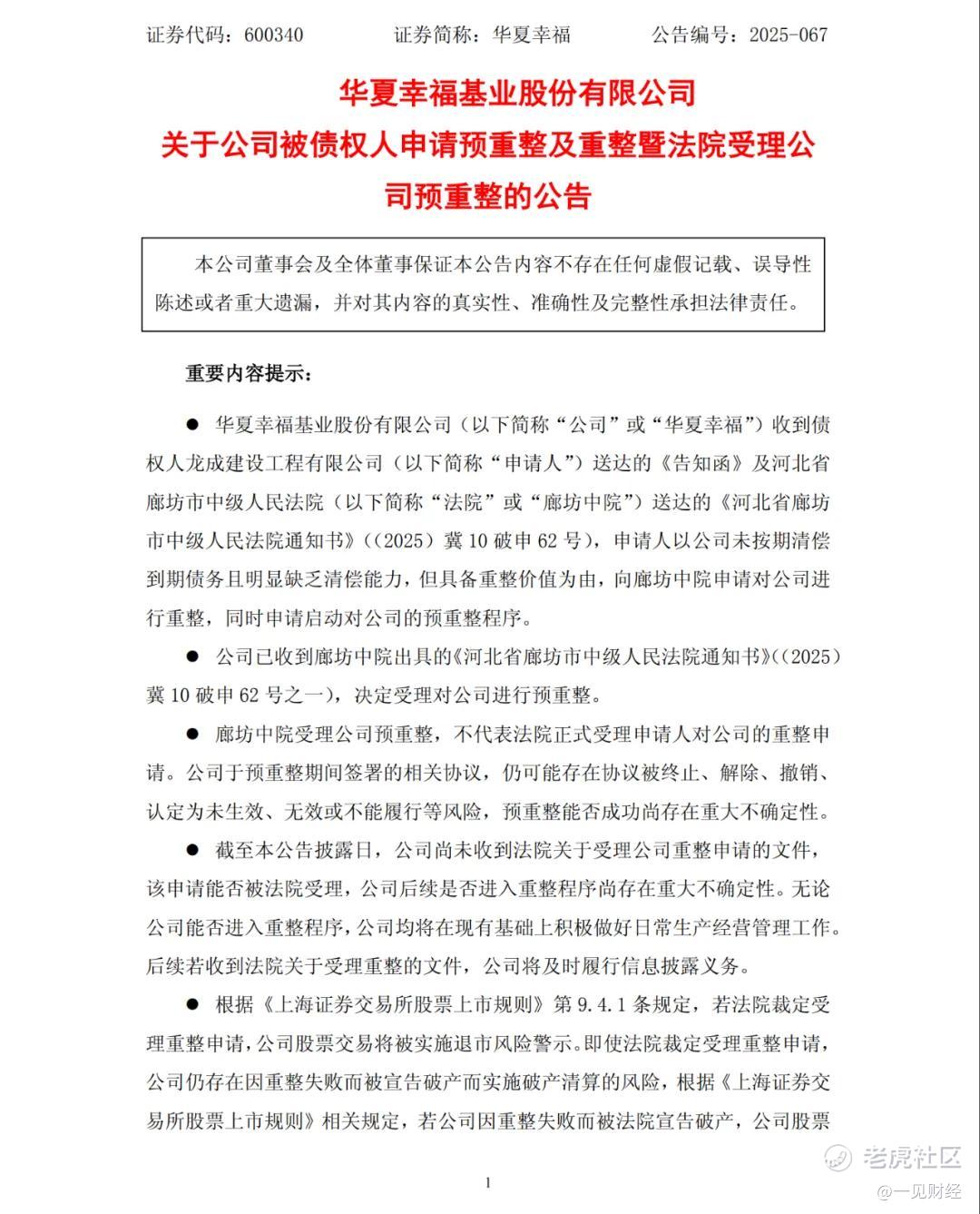 11月17日,华夏幸福公告称,收到河北省廊坊市中级人民法院送达的《通知书》,债权人龙成建设工程有限公司,向河北省廊坊市中级人民法院申请启动华夏幸福重整及预重整程序,目前法院已受理。华夏幸福在公告中强调,“对预重整无异议”。