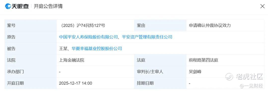 天眼查信息显示,平安系最近起诉华夏幸福及王某,案由为申请确认仲裁协议效力。案件将于12月17日14时在上海金融法院开庭。