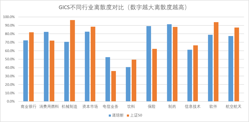 从细分行业权重来看更为明显,GICS三级行业中,上证50的集中度远高于道琼斯工业平均,商业银行占比接近20%。