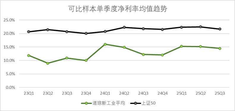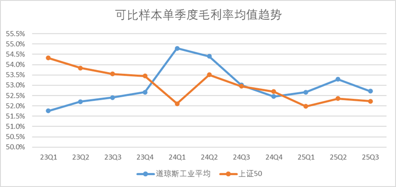 自2023年初至今,道琼斯工业平均可比样本的单季度营收规模从3130亿增长至4080亿左右,以今年最新的三季度报同比来看,增速达到了14%。而上证50单季度营收几乎没有增长,甚至出现了阶段性下滑,今年三季度回暖,同比增速约为10.5%(当然主要是去年三季度基数较低)。