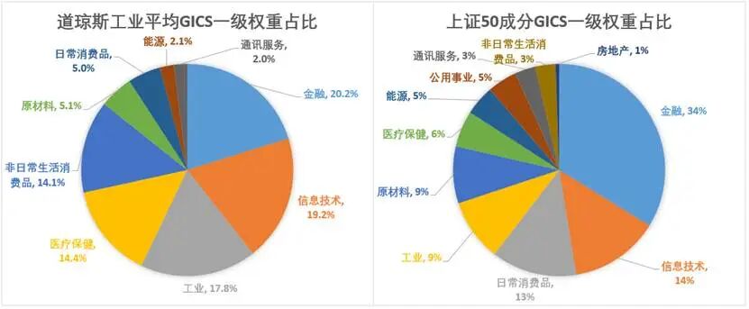 从行业权重占比来看,以GICS一级行业权重占比来看,双方排名前二的权重均为金融和信息技术,只不过上证50的金融类占比更高,达到了34%,而道琼斯工业平均的金融权重占比仅为20.2%