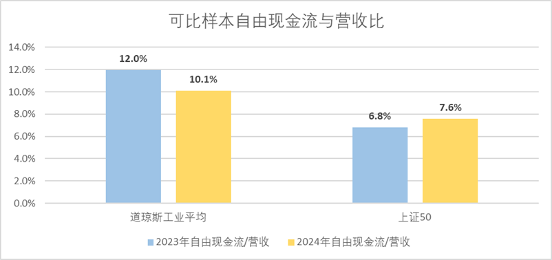 比如我们发现,可比样本企业中,道琼斯工业的自由现金流占营收的比例更高,而上证50自由现金流仍处于低位。