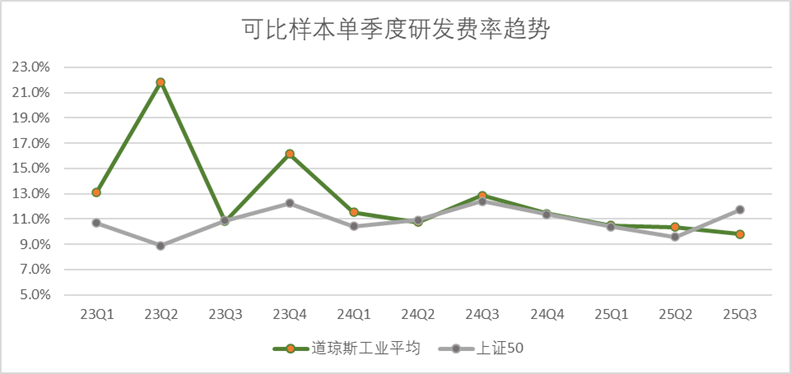 研发费率方面,二者的差距就更小了,我们剔除了未披露研发费率的企业,在可比样本中,道琼斯和上证50的研发费率均在11%区间范围内上下波动。