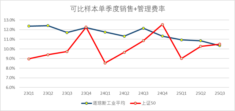 美股报表规则一般将单季度销售费率和管理费率统一为单一科目披露,相对应的我们也将上证50样本标的做同口径处理,并剔除金融行业(会计规则差异)。