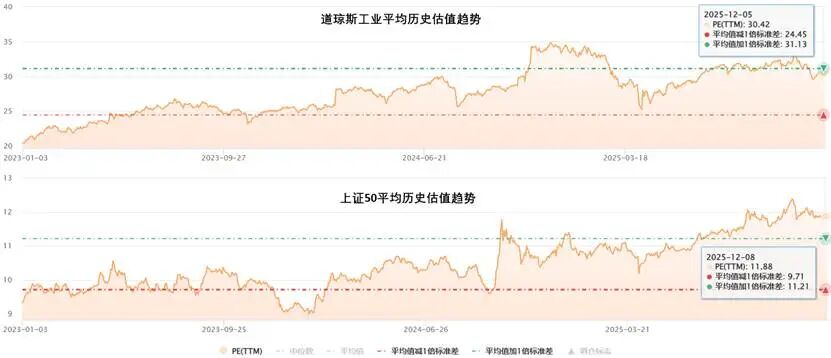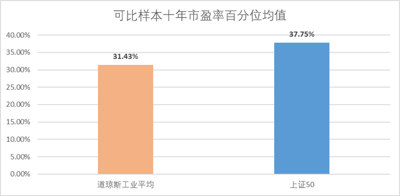 (2)上证50与道琼斯工业平均的估值逻辑趋同,估值水平相差不大
