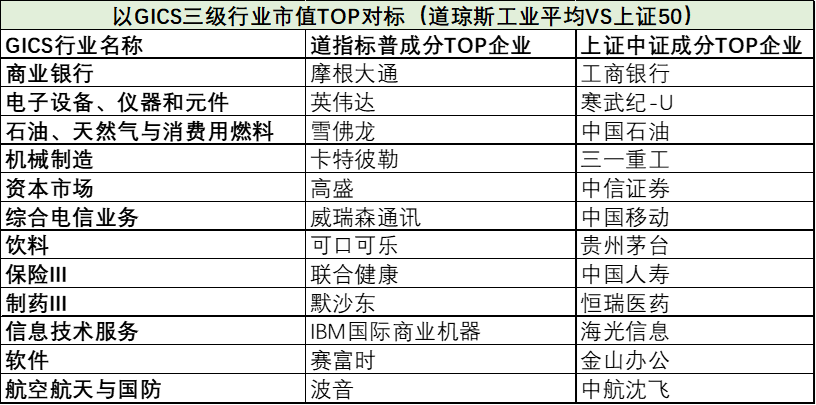 不过显然目前上证50并不具备与道琼斯工业平均直接对比的客观条件,因此我们挑选了12个双方都涵盖的GICS三级行业,并选取各行业中市值最高的企业纳入样本池,形成了可比样本,如下图所示: