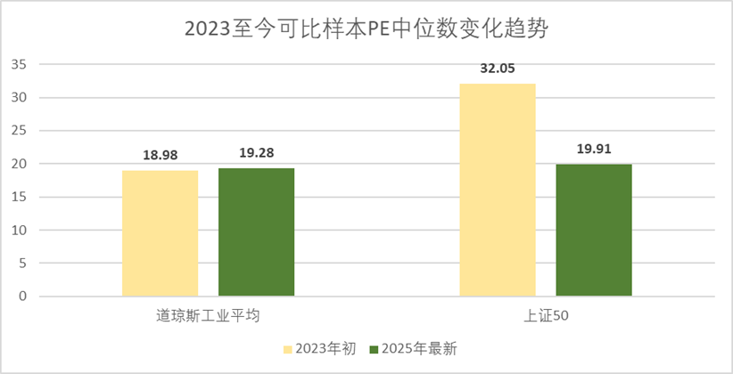 同样的为了保证数据不失真(寒武纪还未实现规模盈利),我们还是剔除前沿半导体,以今年最新一季财报口径下的PE-ttm对比来看,道琼斯工业平均约为19.3x,而上证50约为19.9x,二者差距不大。