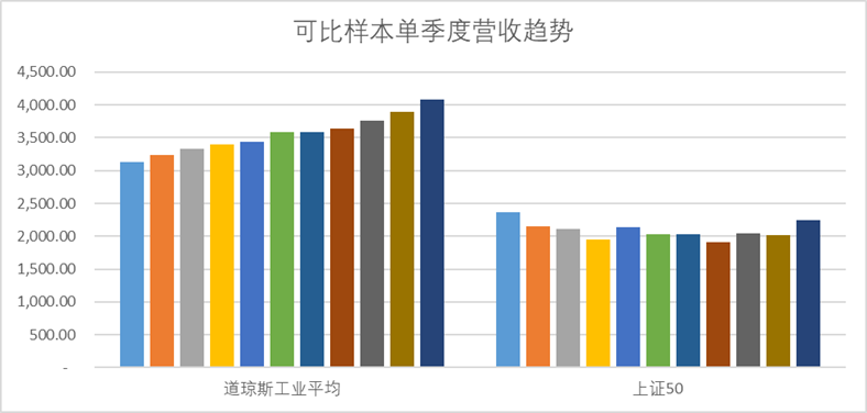 接下来的行文中,我们将道琼斯和上证50对比替换为图片中的可比样本(单位统一为“亿美元”,数据均来自Choice金融客户端),具体的对比如下。