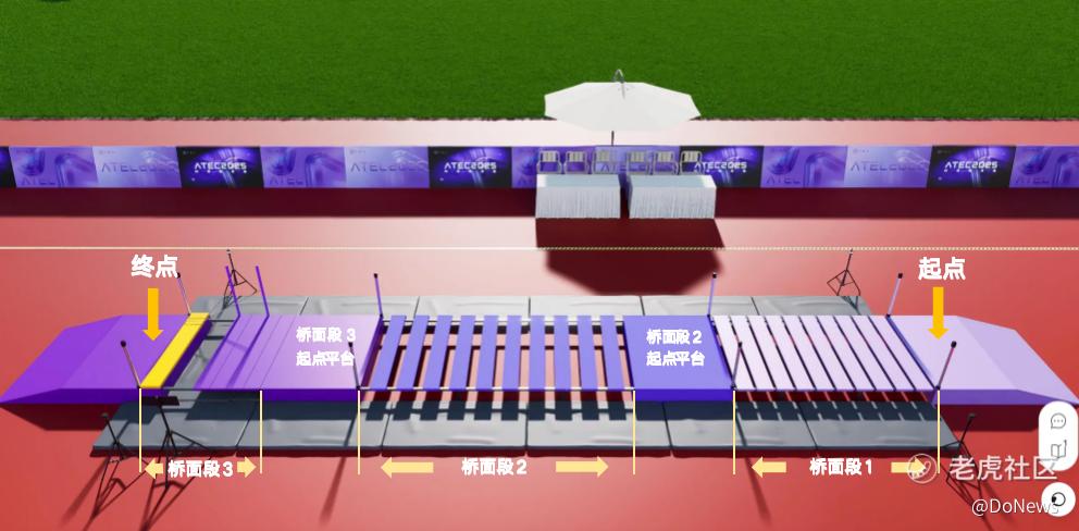 吊桥穿越要经过三种不同间距的桥面段,看似不长的一段距离,“哐当”成了机器人选手们的主旋律。重心低的机器狗还好,人形机器人摔一下看着就肉疼,还有的双足机器人另辟蹊径,在脚底捆上了加长的木板,让人直夸“小机灵鬼”。