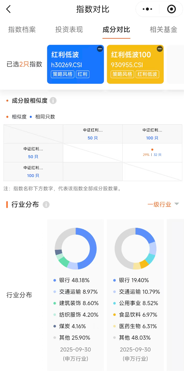 因为当我想研究ETF,比如高股息的或者红利ETF,我真的不知道买哪个,因为他们名称都差不多,持仓也差不太多,很难比较,但我用了“红色火箭”--“指数对比”功能之后,就发现简单多了,比如做个对比--两个红利etf,一眼看出区别: