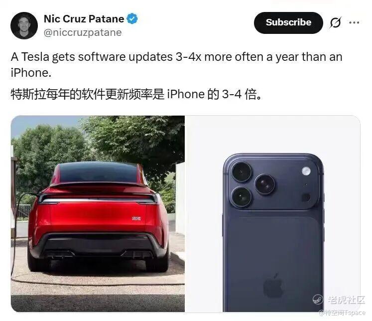 与此同时,据他统计,特斯拉每年的软件更新频率达到苹果手机的3至4倍,让车主可以不断免费获得新的功能,“不花钱”就能开新车。