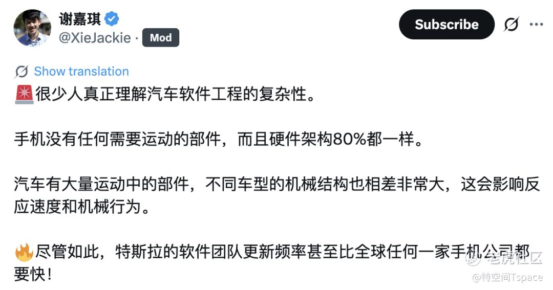 博主@XieJackie 表示,相比手机等电子产品,车辆软件开发独具挑战。“与手机不同,汽车拥有大量部件,且不同车型的机械结构差异显著,这直接影响着车辆的反应速度与机械行为。”而特斯拉的软件团队不仅克服了这些挑战,其软件更新速度甚至超越了全球任何一家手机厂商。