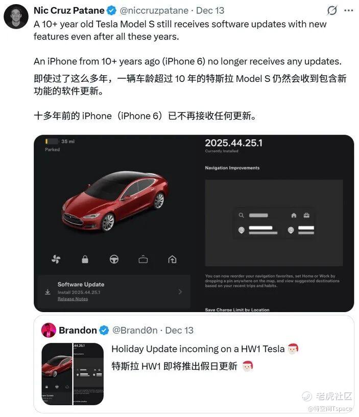 据博主@niccruzpatane 分享,一辆车龄已超过10年的特斯拉Model S,目前依然能收到最新的OTA远程软件升级进行功能更新;作为对比,10多年前发布的iPhone 6早已停止系统更新。