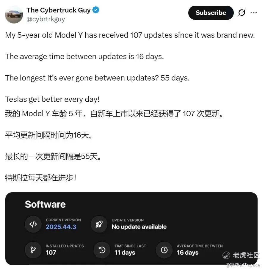 来自海外的Model Y车主@cybrtrkguy 在社交平台分享了爱车5年来的OTA远程软件升级记录。据统计,车辆已累计完成107次更新,平均每16天就能体验一次功能升级,“感觉车辆每天都在变得更好!”