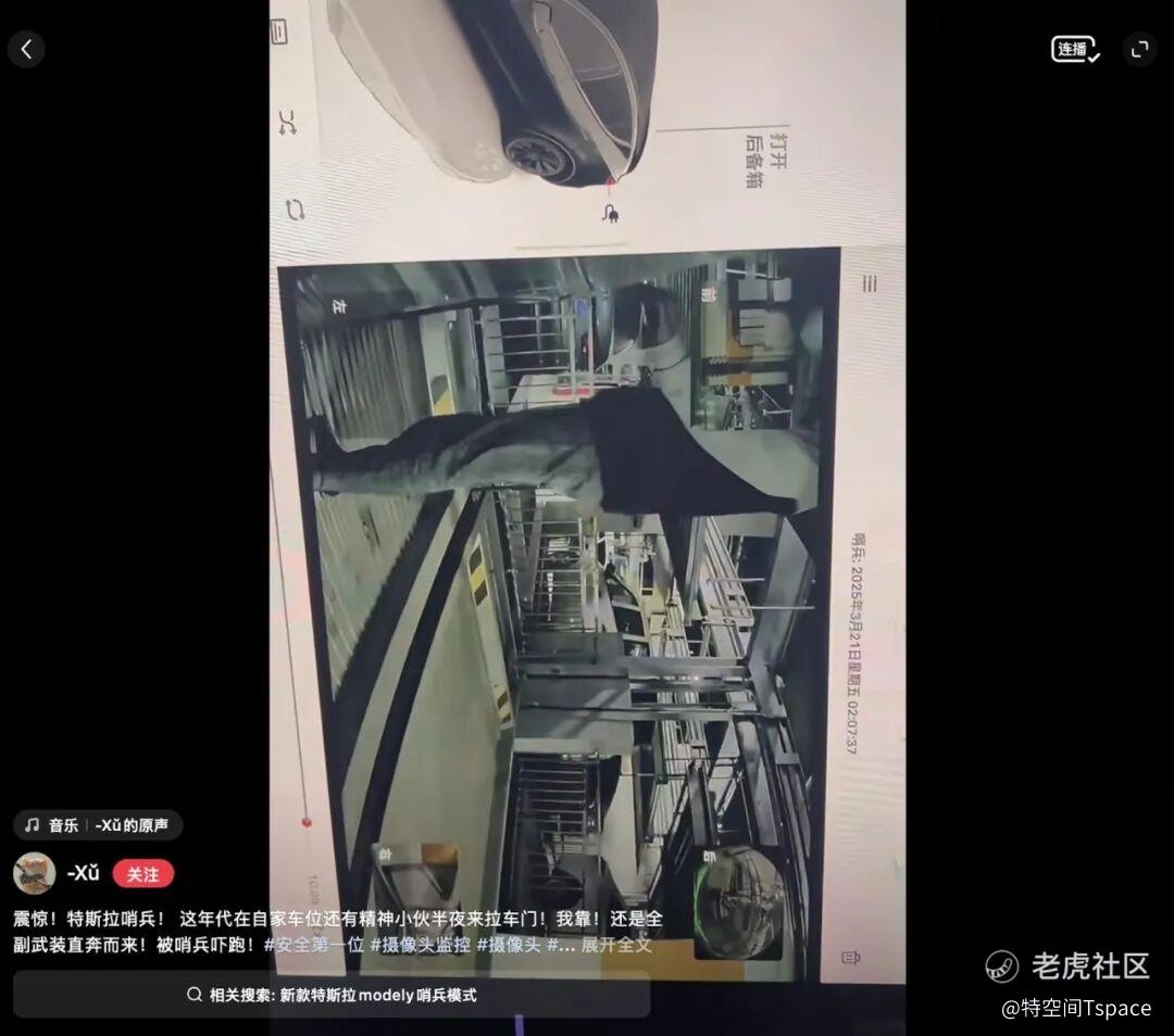 在网友@-Xǔ 的分享中,两名“全副武装”的陌生男子直奔车库里停放的特斯拉,试图拉开车门实施破坏或盗窃。就在其靠近车辆并尝试拉开车门时,特斯拉的哨兵模式不仅把全过程记录下来,还及时发出警报,将对方当场“吓退”。