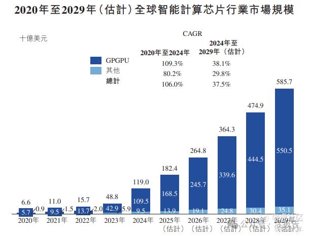 以收入计,全球智能计算芯片市场从2020年的66亿美元快速增长至2024年的1,190亿美元,复合年增长率(「CAGR」)为106.0%。预计未来五年市场将保持快速增长,并于2029年达到5,857亿美元,2024年至2029年的CAGR为37.5%。